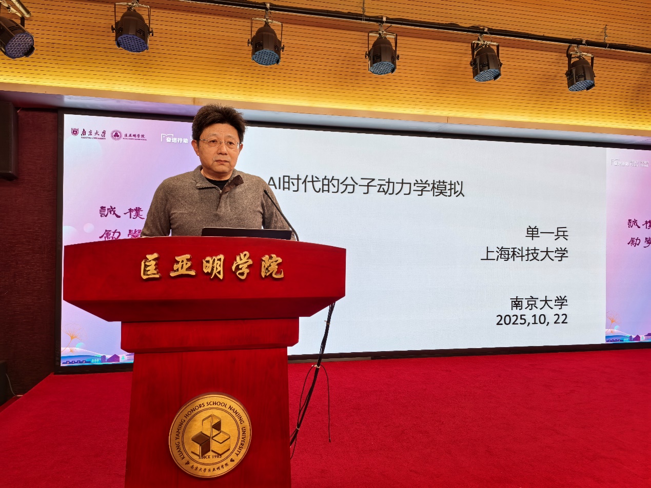 2025 年 10 月 22 日下午,25学年秋季名师导学课程顺利举行。本次讲座特邀上海科技大学单一兵教授,带来题为《AI 时代的分子动力学模拟》的报告。报告从分子动力学模拟的算力瓶颈切入,层层递进阐释专用超算与 AI 技术如何深度融合,加速生物医学尤其是药物研发领域的突破式发展。