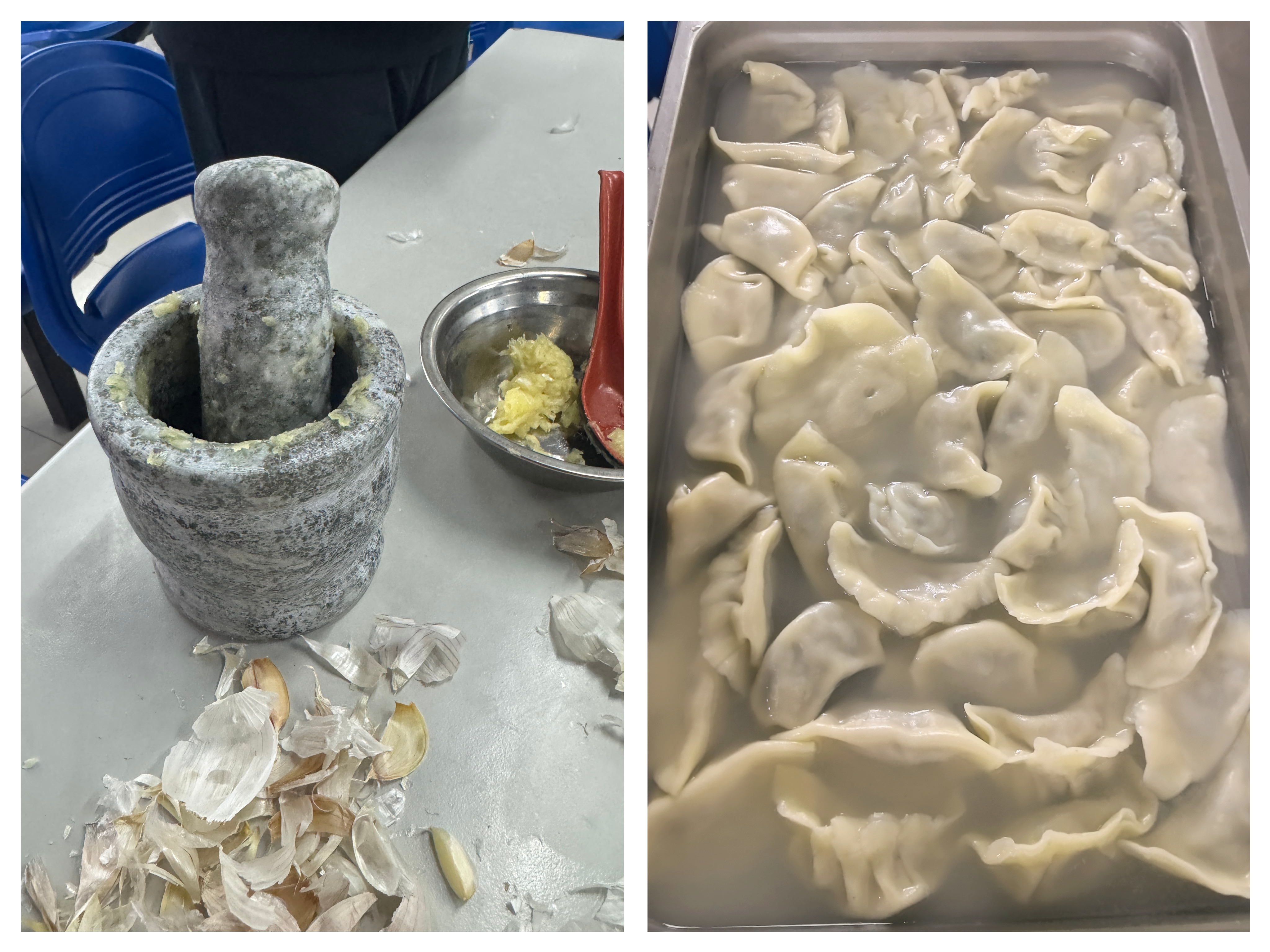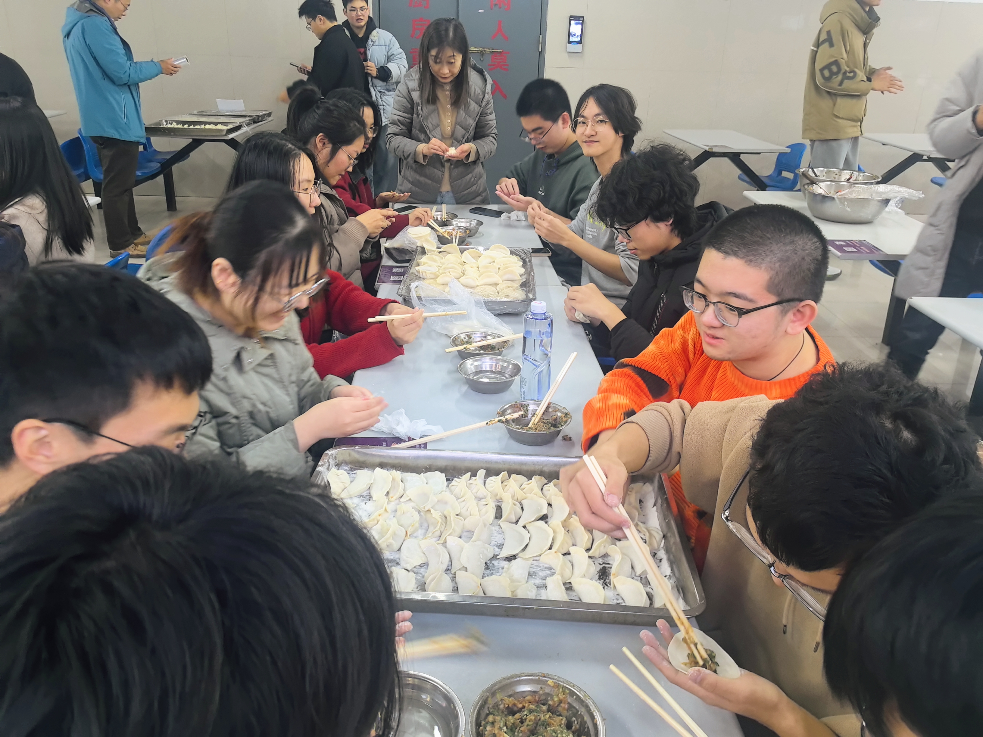 活动中,师生们齐聚一堂,热情高涨,现场欢声笑语不断,分享着家乡习俗和生活趣事。周媛亲自给围坐桌前的同学们现场示范包饺子的经验和技巧,从经验丰富的包饺子高手老师到首次尝试的同学,来自不同地域的大家各显身手。一双双灵巧的手,将一个个饺子赋予了生命,有的圆润饱满,有的创意十足,形态各异,尽显同学们的心灵手巧。