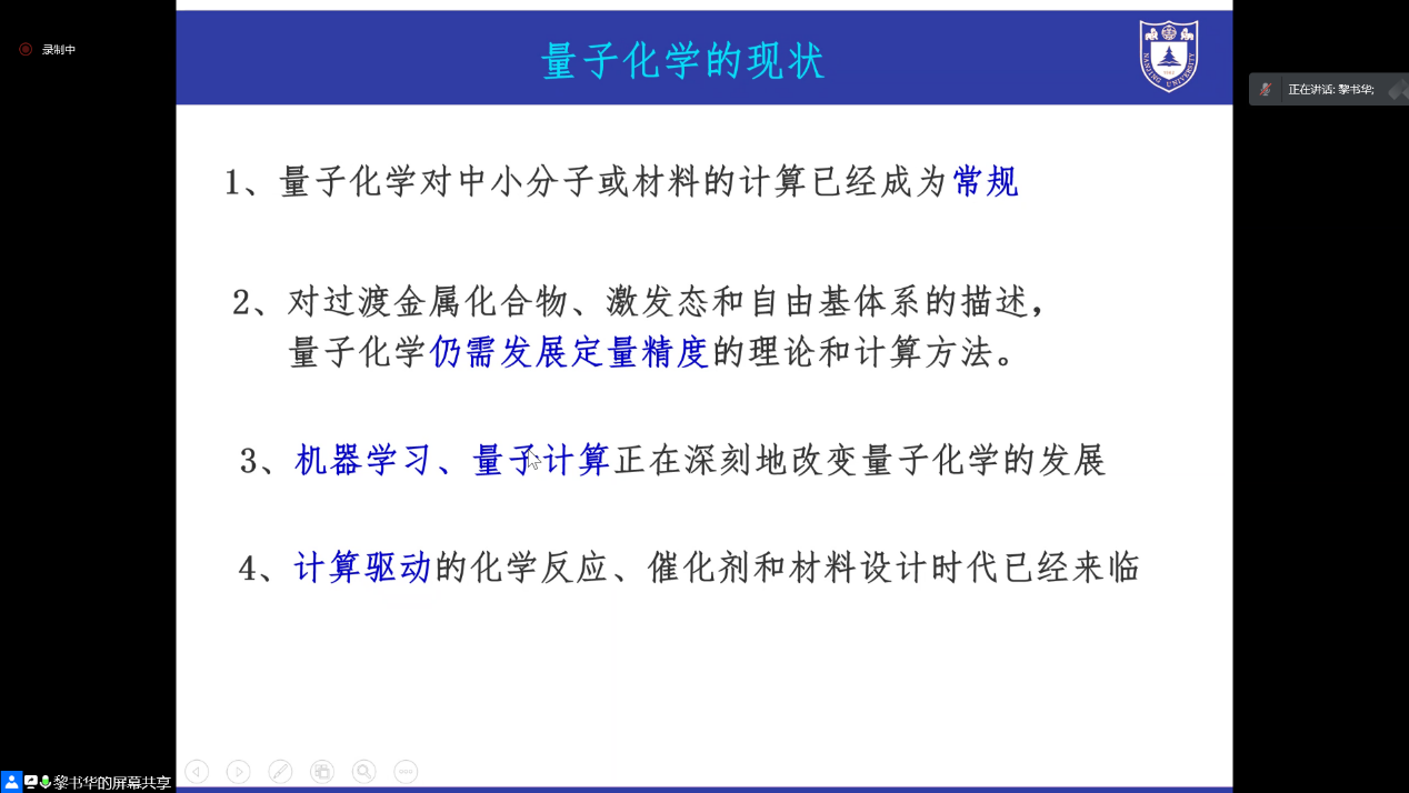 第四部分,黎教授向我们介绍了量子化学的现状:量子化学正值时代,但仍有困难,还需要年轻一代的科学家们投身努力