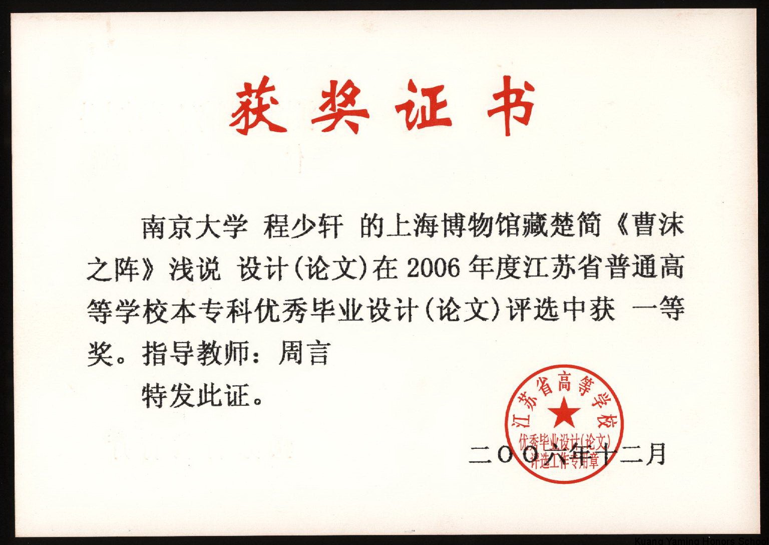 2002级文科班程少轩获省级优秀毕业论文一等奖