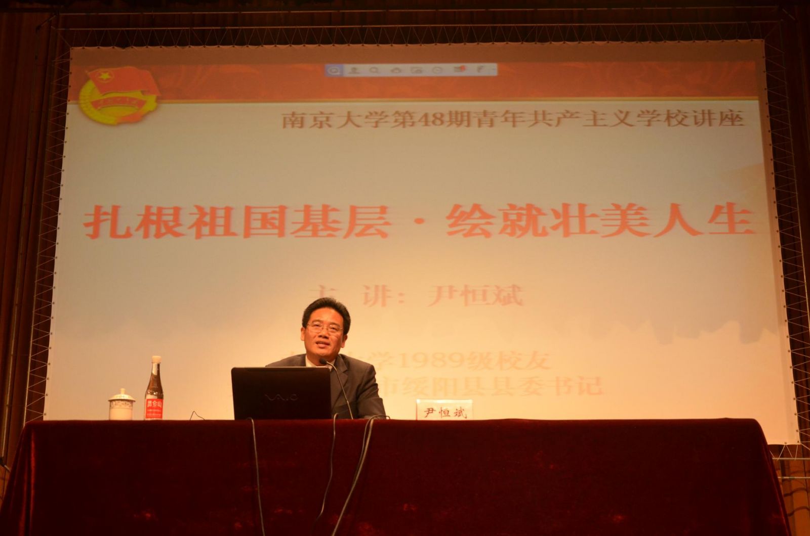 此次“扎根祖国基层绘就壮美人生”的报告中,尹书记首先回忆了他在南大读书期间的美好时光,谈到第一次中秋远望家乡,怀念亲人的心境,谈到获得奖学金和同学们一起共享时的趣事,谈到担任学生会主席后的种种担当,也谈到他在南大青共校学习的收获。毕业后,尹书记当时面临种种机会和选择,由于盐城市委组织部领导诚挚的感召以及对母亲的牵挂,他放弃了留校工作的机会,回到了家乡盐城。2007年担任建湖县委常委以及组织部部长后,他迎难而上,大力推动建湖开发区工作,发展经济,取得了卓越的成效。谈到这些工作经历,尹书记感慨万千,经过多年基层工作的锻炼,他收获良多,对民生工作、经济建设、干部管理等方面都有独到的思考和丰富的经验。2011年,他响应中组部号召,主动请缨支持西部工作,离开家人去遥远的贵州省遵义市绥阳县担任县委书记,开启了自己政治生涯的新篇章。