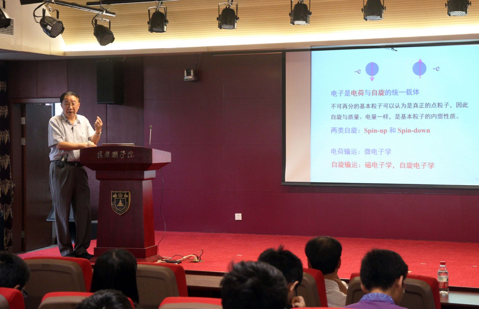在这些研究领域,每年都会做出很多丰硕的成果:磁性金属与氧化物的磁电子学方面的相关研究已经获得了诺贝尔奖,自旋电子学与拓扑电子学仍在发展中。这里有一个有趣的效应叫做巨磁电阻效应,即外加磁场导致材料的电阻发生巨大的变化,而这种效应也是大家熟知的硬盘的存储原理。为了形象地让同学们理解,邢院士用了二电流通道模型,并用男女生去食堂各走一条路来类比巨磁电阻效应中电子的行为。邢院士还讲到了拓扑绝缘体,其中涉及了现在同学们正接触学习的霍尔效应,也让同学们了解到有两次诺奖都颁给了量子霍尔效应。