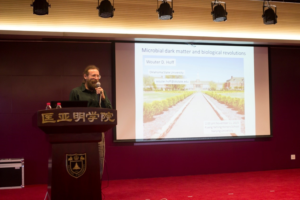 11月11日下午2:00,美国俄克拉荷马州立大学生物化学教授Wouter Hoff为2014级同学们作了题为“Microbial Dark Matter and Biological Revolutions”的讲座。作为生物化学研究的知名专家,Wouter Hoff教授主要研究基因组以及相关生物化学问题。Wouter Hoff教授从DNA的三种测序方法,电子显微镜的发展,再到基因组的测定及研究,始终贯穿着生物学思想中的创新思维,还配以生动的动画讲解,形象易懂,深入浅出。讲座由东京热 王炜院长主持。