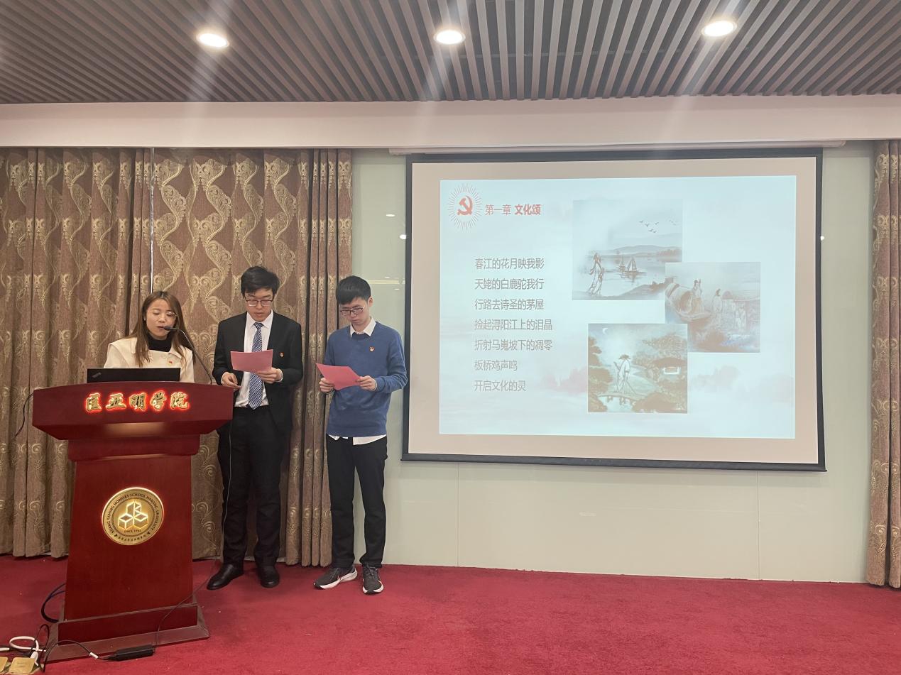 最后上台的“歌以咏史队”朗诵了原创诗歌《百年颂》。第一章《沁园春·峥嵘百年》回顾中国共产党百年征程中的大事件,之后的三章内容则描绘中国的优秀文化、劳动人民和大好河山,从侧面反映了中国共产党取得的伟大成就。在悠扬的背景音乐中,三名队员齐声朗诵诗歌,为本次比赛的演讲环节划上了完美的句号。