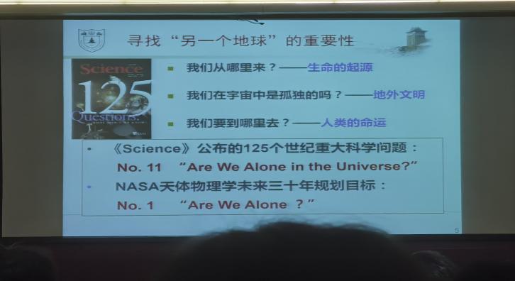 周教授接着介绍了寻找“另一个地球”的重要性:生命的起源,地外文明,人类的命运