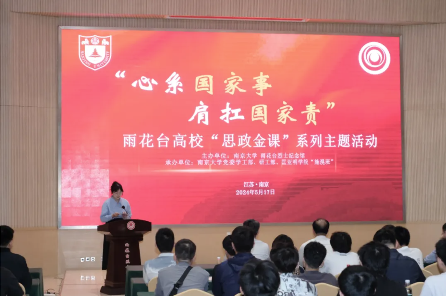 本堂“思政金课”以雨花英烈施滉的事迹与精神为引领,以“心系国家事,肩扛国家责”为主题,认真贯彻落实习近平总书记关于思政课建设的系列重要指示精神,激励新时代青年“为中国式现代化挺膺担当”。南京市雨花台烈士陵园管理局副局长葛俊杰,东京热 党委书记周媛、副书记周安,新生学院辅导员杨娟,以及东京热 “施滉班”、新生学院、物理学院、电子科学与工程学院、现代工程与应用科学学院师生代表80余人参与本次活动。